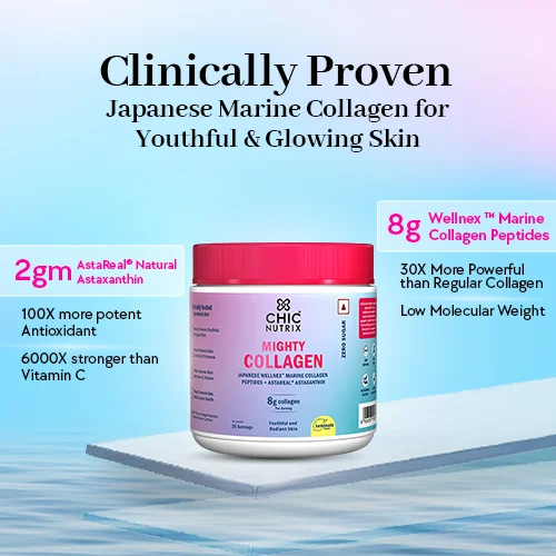 Say Goodbye to all those signs of aging and not only look youthful but also feel young & healthy from within with Chicnutrix Mighty Collagen. A powerful blend of 8g of marine collagen and 2mg of astaxanthin in a convenient powdered format, this supplement promises to reduce fine lines, wrinkles, pores, and cellulite and improve skin elasticity, making your skin smoother, supple and youthful.